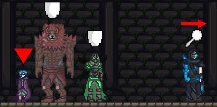 In this example, the Oracle, Brute, and Warden are all in the Support stance, choosing to ignore the enemy, and form a formation around the currently controlled Traveller, which is the Oracle. This formation depends on what Traveller is being controlled, as well as the list of Travellers currently in the Support Stance. In this example, the Oracle is being controlled, and as such, the Warden goes in front of her to absorb the damage, while the Brute defends behind her; both Travellers ready to utilise their abilities if the need arises.