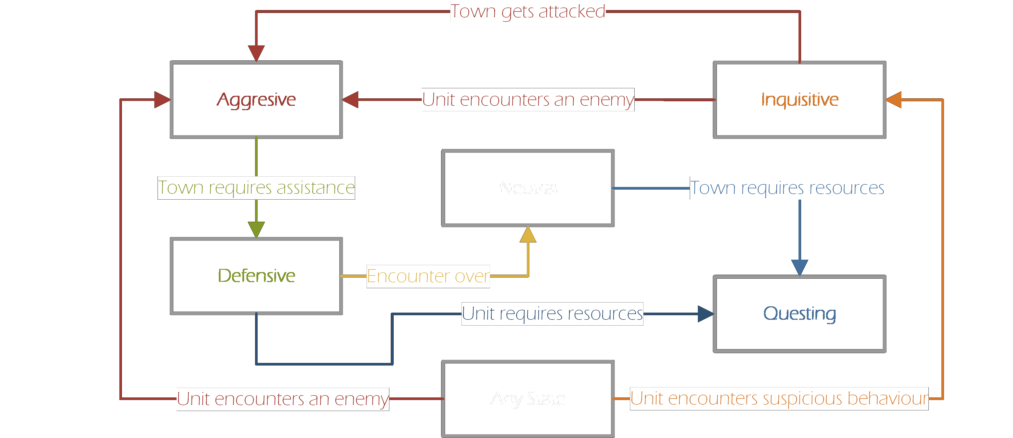 Upon first tackling AI, I decided to break it down by assigning distinct behaviours that each unit cycled between, varying from; Neutral, Inquisitive, Aggressive, and Defensive. Each state contains its own behaviour tree and can be changed according to what situation that unit is currently dealing with, influencing certain elements of their game styles. This offers the player the potentiality to play around and influence units much easier as they slowly learn and understand how each stance affects each action. As I expanded upon this system, I added more creative behaviours such as Questing, allowing units to interact in a believable sense within the kingdom's economy with their purchasing of potions and armour before venturing out on a quest, adding to the realism.
