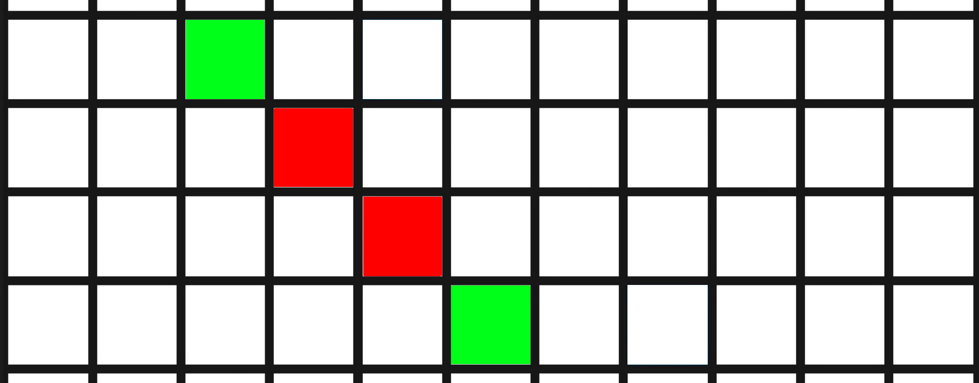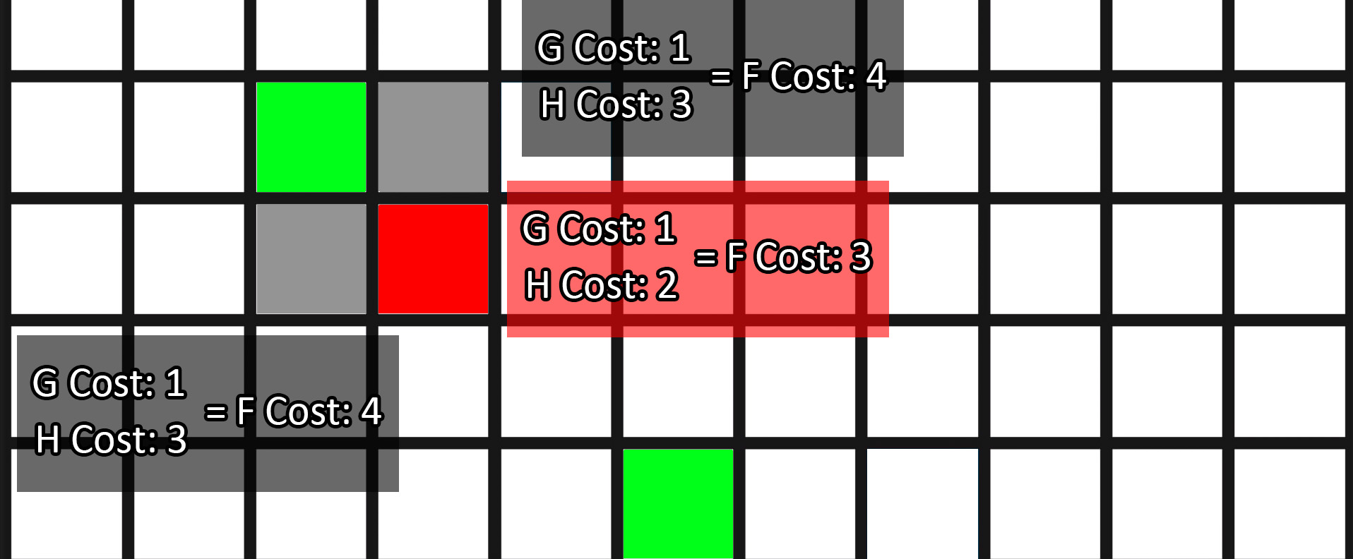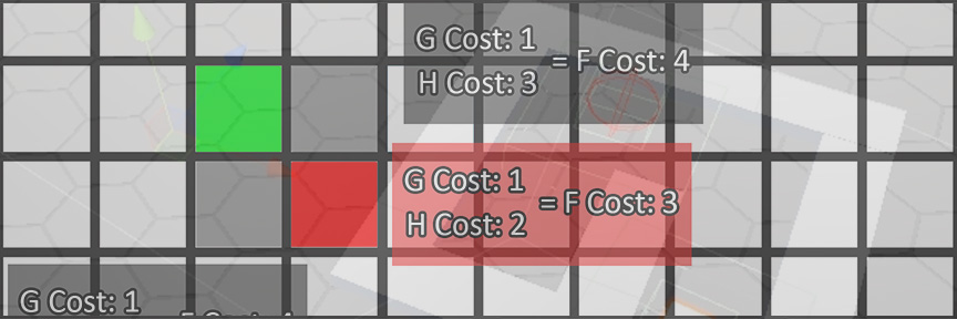 So, to briefly explain, A* pathfinding works by first drawing a grid filled with 1x1 nodes. Placing down two positions, the target, and goal, and then trying to locate the shortest path between the two by calculating the vertical and horizontal movement. In this diagram, we're trying to calculate the distance from both green squares starting with a G cost - how far that currently selected node is from the start, and then adding it to the H cost - how far that selected node is from the end node, resulting in the accumulative F cost.