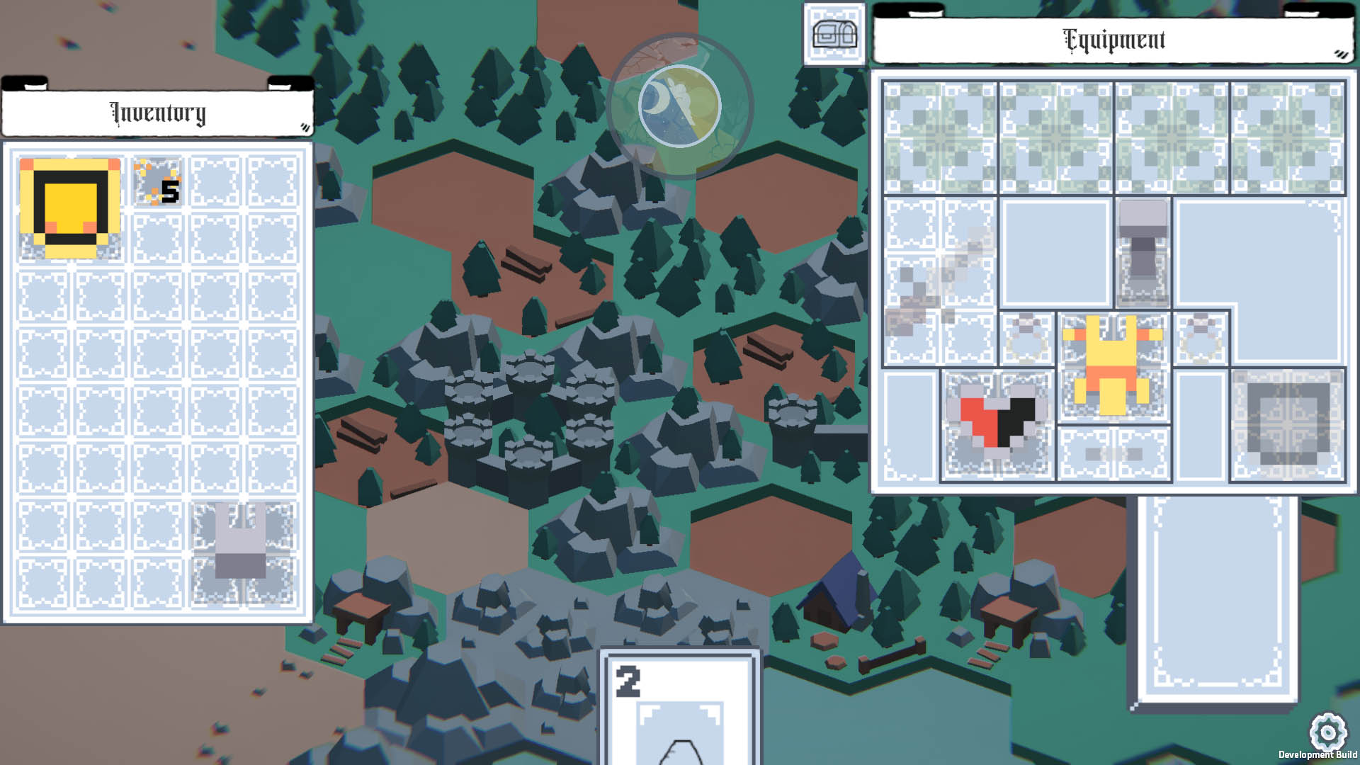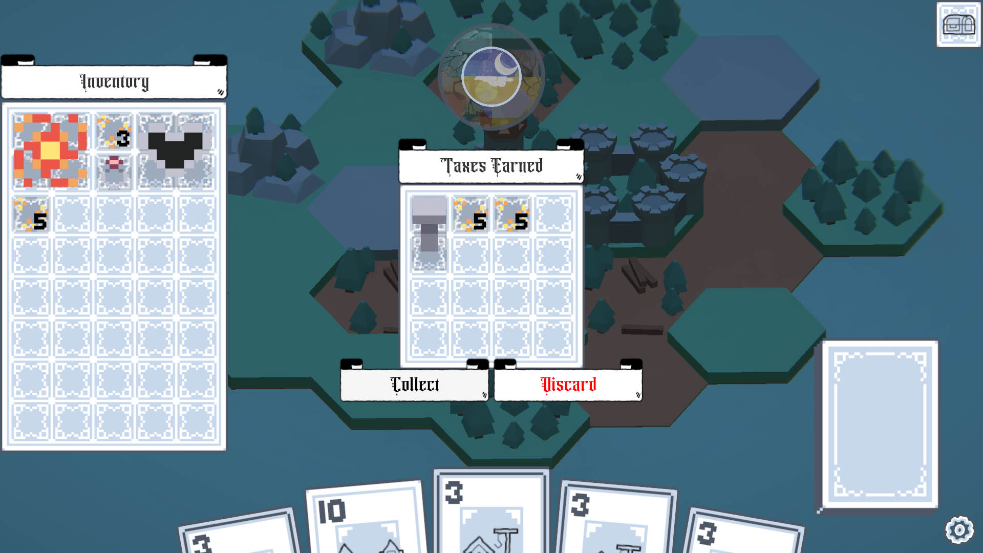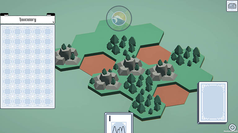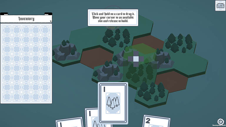 Cards get drawn every 15 seconds, and players receive random ones at the end of every day. The player can then click and drag the cards onto the world to create a building, receiving more items, gold, and cards the following day.